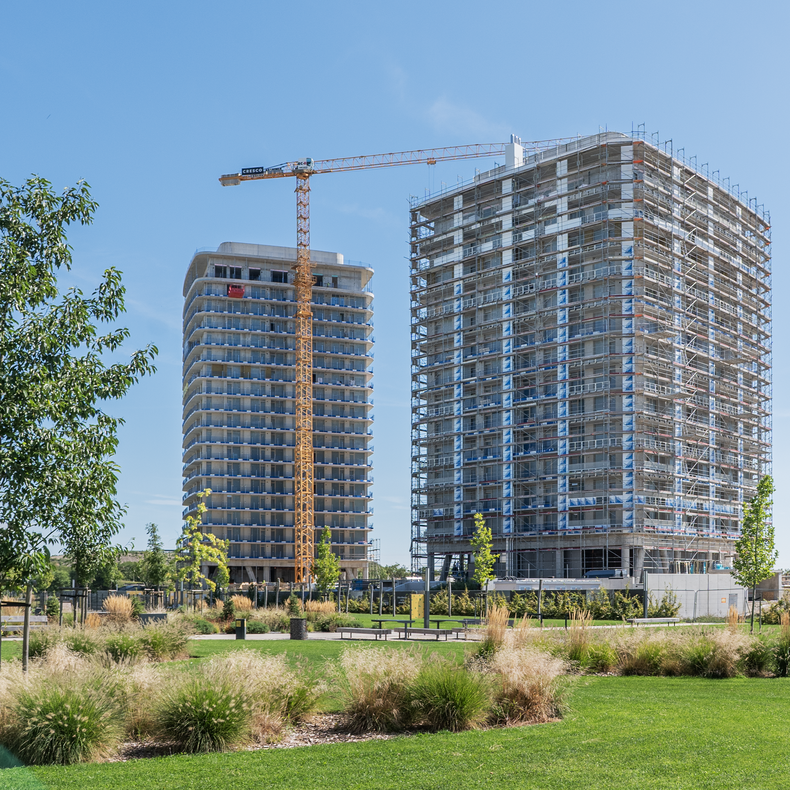The shell construction of the 19- and 14-storey towers - which have already become southern Bratislava’s new landmark – is now finished. Construction is scheduled for completion in 2026.